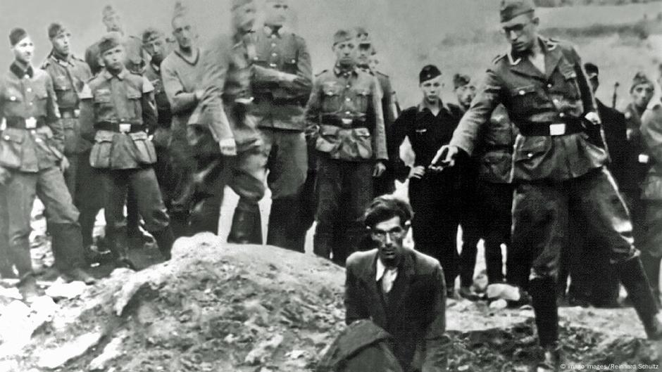 A man in a long coat with a full head of hair and sunken cheeks, kneels at the edge of a mass grave, resigned to his fate.
