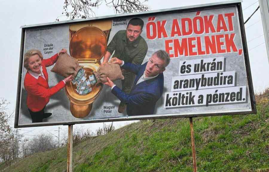 In Hungary, on the eve of parliamentary elections, caricature billboards appeared featuring European Commission President Ursula von der Leyen, Volodymyr Zelenskyy, and Hungarian opposition leader Péter Magyar.